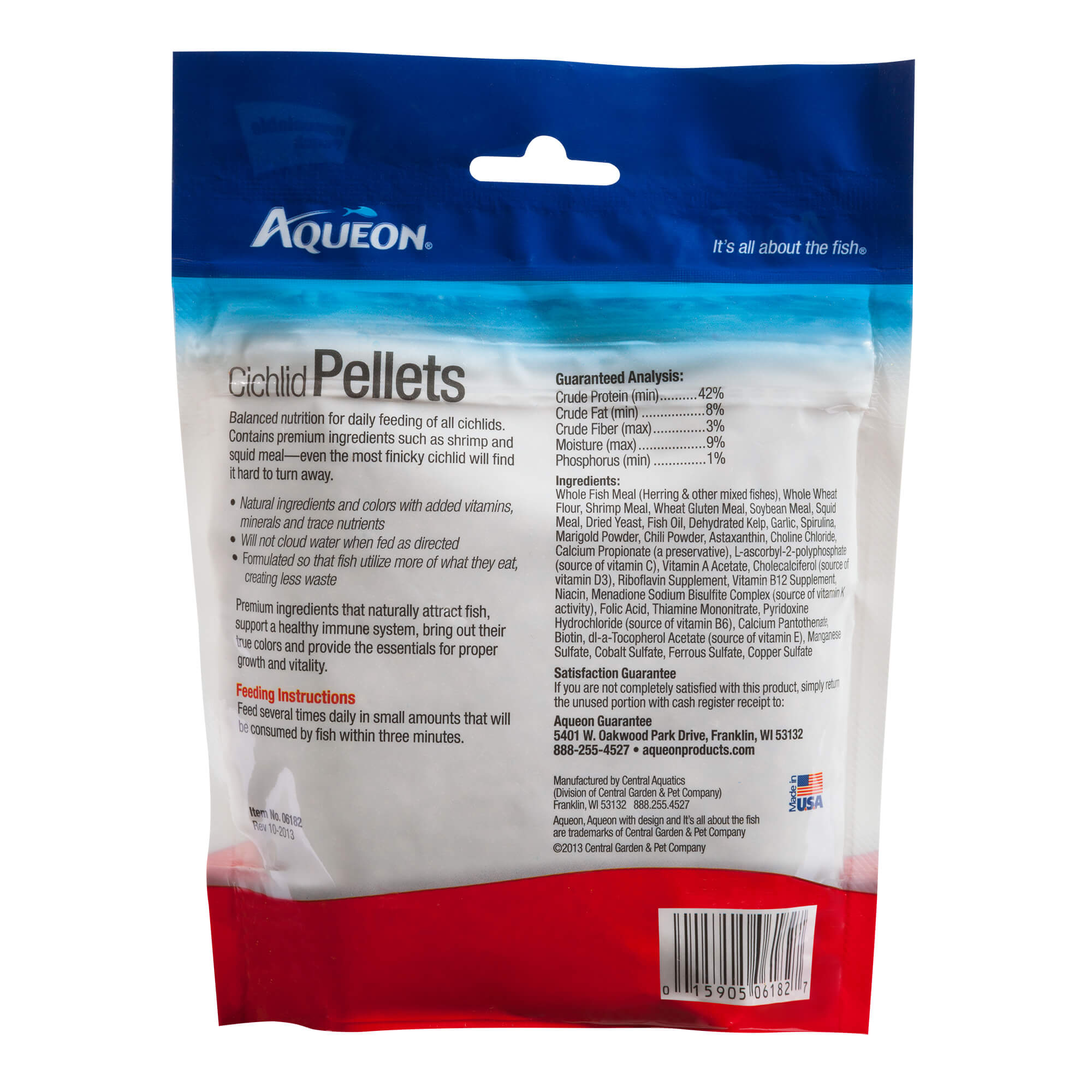 Aqueon Cichlid Pellets are made with premium, like shrimp meal, squid meal, kelp and spirulina, to attract the most finicky cichlids. Available in two pellet sizes for small to large cichlids. Satisfaction Guarantee. Contains premium such as shrimp and squid meal that all types of cichlids should enjoy. Quality, nutritious naturally attract fish, support a healthy immune system, bring out their true colors and provide the essentials for proper growth and vitality. Formulated so that fish utilize more of what they eat and create less waste. Will not cloud water when fed as directed. Ideal for South American, West African and Carnivorous Rift Lake Cichlids