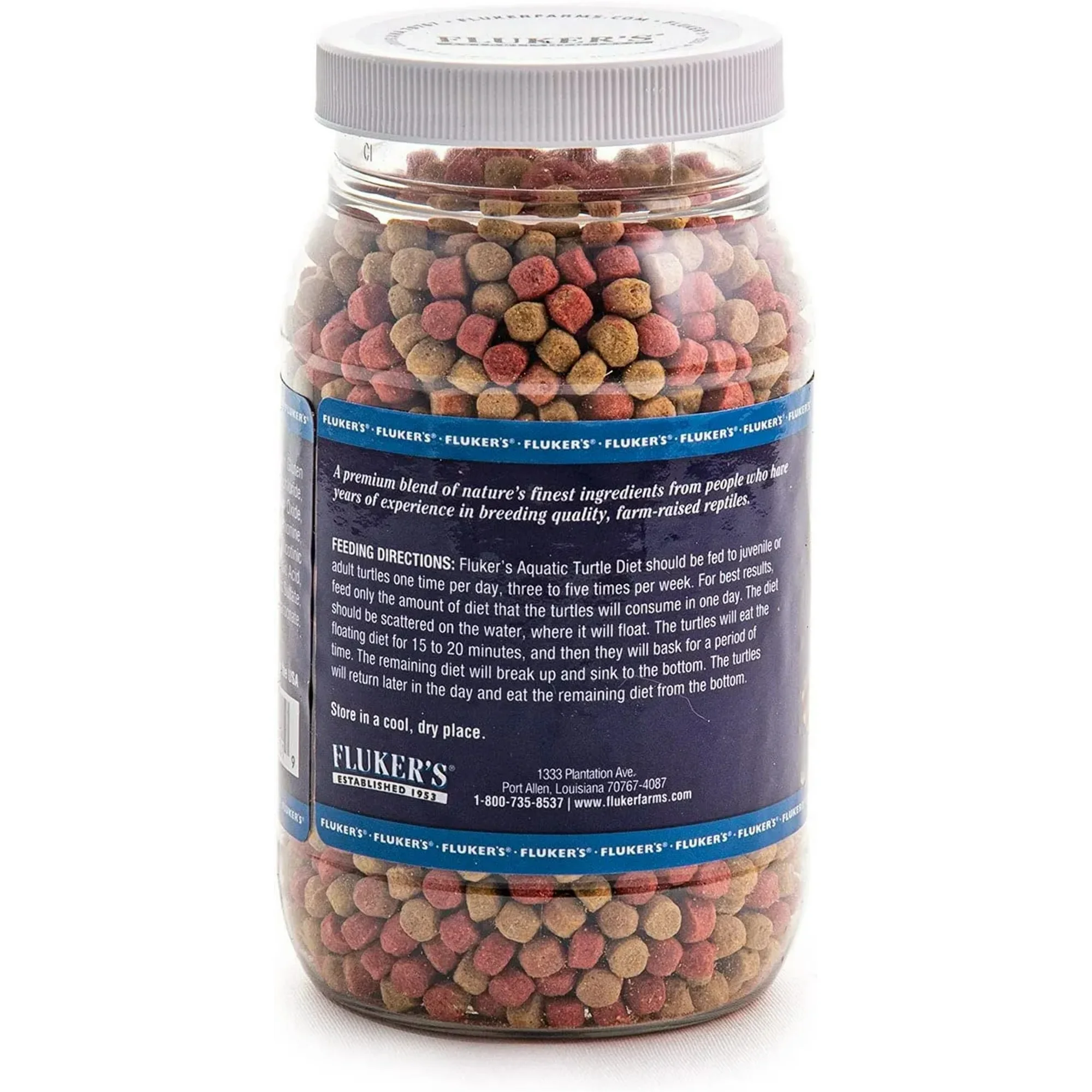 A premium blend of nature’s finest ingredients from people who have years of experience in breeding quality, farm-raised reptiles. Fluker’s Aquatic Turtle Diet should be fed to juvenile or adult turtles one time per day, three to five times per week. For best results, feed only the amount of diet that the turtles will consume in one day. The diet should be scattered on the water, where it will float. The turtles will eat the floating diet for 15 to 20 minutes, and then they will bask for a period of time. The remaining diet will break up and sink to the bottom. The turtles will return later in the day and eat the remaining diet from the bottom.
