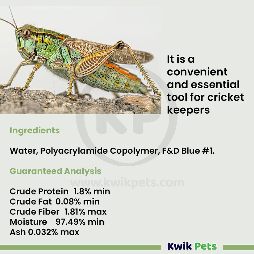 Provides crickets and other feeder insects with a safe, clean water source in a convenient gel form that eliminates the problems of traditional watering methods – such as drowning and bacterial contamination.